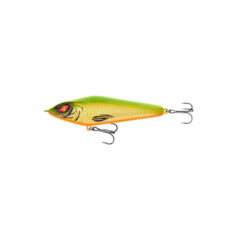 Vid monoton inspinning så går den i stora S-kurvor (slingrande rörelsemönster). Vid jerk så har den ett bra glid och härligt häng! Fiskas bäst med något nättare knyckar eller med en vev-jerkande teknik. Otroligt lättfiskad! Invändigt finns rasselkammare för en extra lockande effekt.