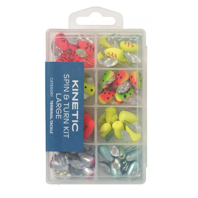 Kinetic Spin&Turn Kit – Large. Med detta kit kan du få vilken rig som helst att flyta eller spinna i vattnet. Med 8 stycken glödheta färger så kommer du fånga fisk som aldrig förr! Tillverka dina egna Spin-N-Glo eller montera dessa på ditt långedrag, har oändliga möjligheter!