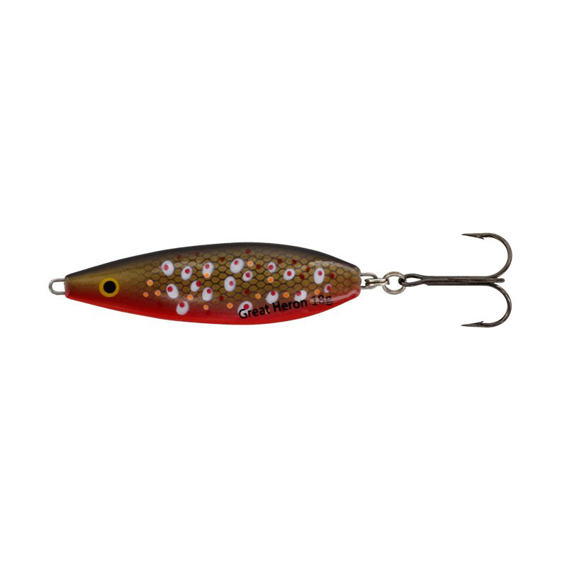Westin Great Heron väger 13 gr och är 55 mm lång. Det har en böjd kropp, som ger den en oemotståndlig gång i vattnet. Perfekt för kustfiske efter öring. Den har en blyfri konstruktion och har dubbla fjäderringar, vilket innebär att fisken får svårare att slå sig lös när du har krokat den. Great Heron har en trekrok (VMC 9649 BN) i storlek 6.
