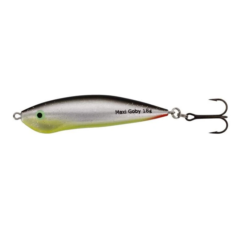 Westin Maxi Goby väger 13 gr och är 60 mm lång. Den är sjunkande med Ultra Sonic rasselkulor som väcker fisken till liv och får den att hugga. Med sitt oregelbundna rörelsemönster triggar den såväl öringar, som rödingar. Den kan fiskas väldigt långsamt om det önskas. Ett spinnstopp då och då gör att betet plötsligt flyr (sjunker) från rovfisken.